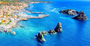 We are located along the stunning Catania coastline, in the charming fishing village of Aci Trezza. Our iconic Cyclopean Isles (Isole dei Ciclopi), volcanic sea stacks located just offshore, rise dramatically from crystal-clear waters teeming with rich Mediterranean biodiversity.